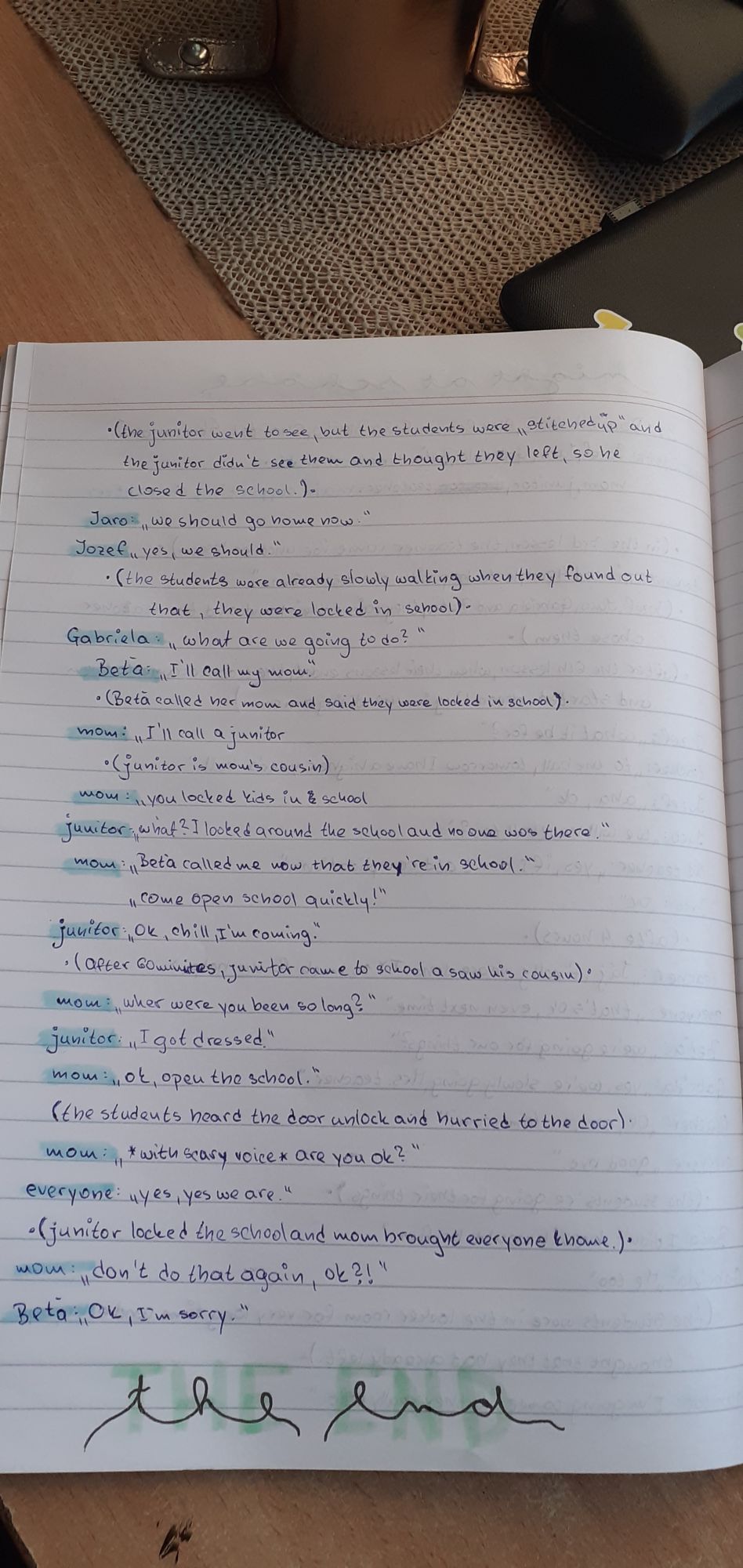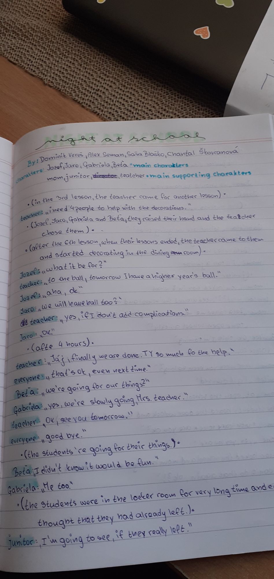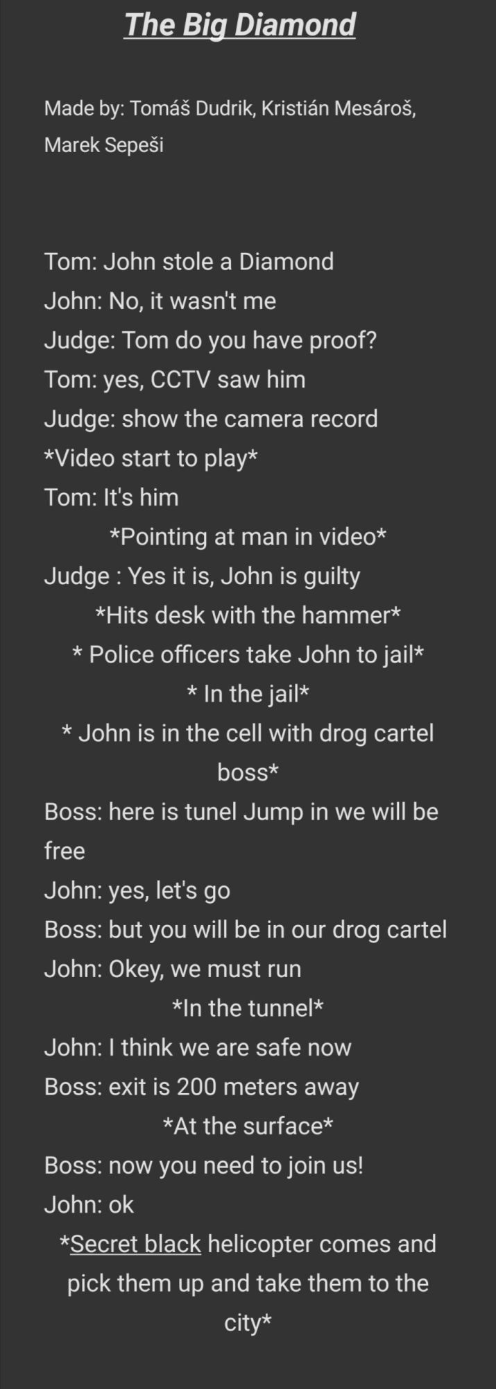 Tému, obsadenie postáv, ale aj dialógy v anglickom jazyku vytvárali sami a pri čítaní ich scenárov je vidieť, že kreativita im skutočne nechýba. Tieto scenáre sú autentické, preto veríme, že prípadné chybičky im odpustíte alebo si ich ani nevšimnete. A nezabudnite svoje deti pochváliť, zaslúžia si to.