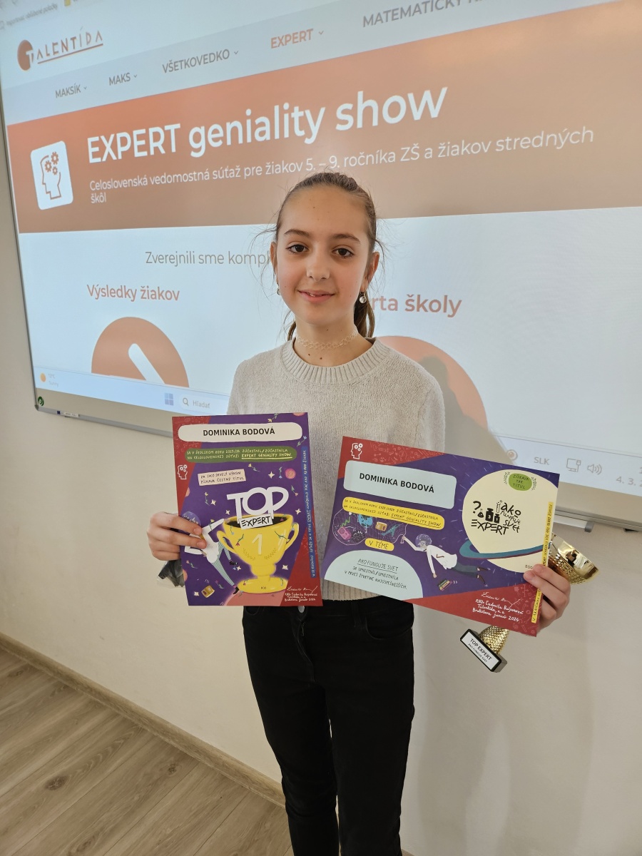 - Dominika Bodová zo 6.A triedy sa stala Expertkou v téme „Ako funguje svet“ a zároveň sa stala TOP EXPERTKOU!