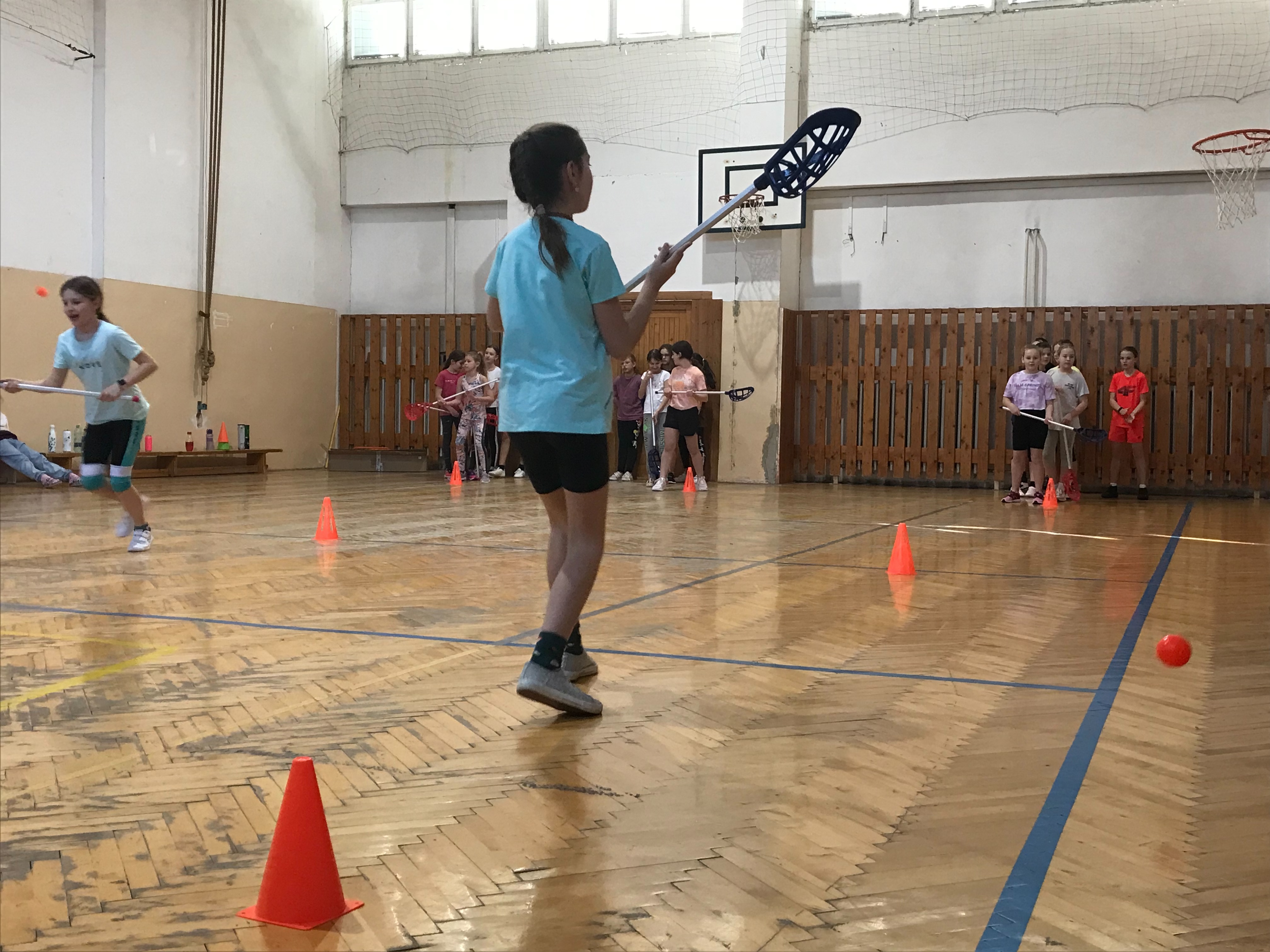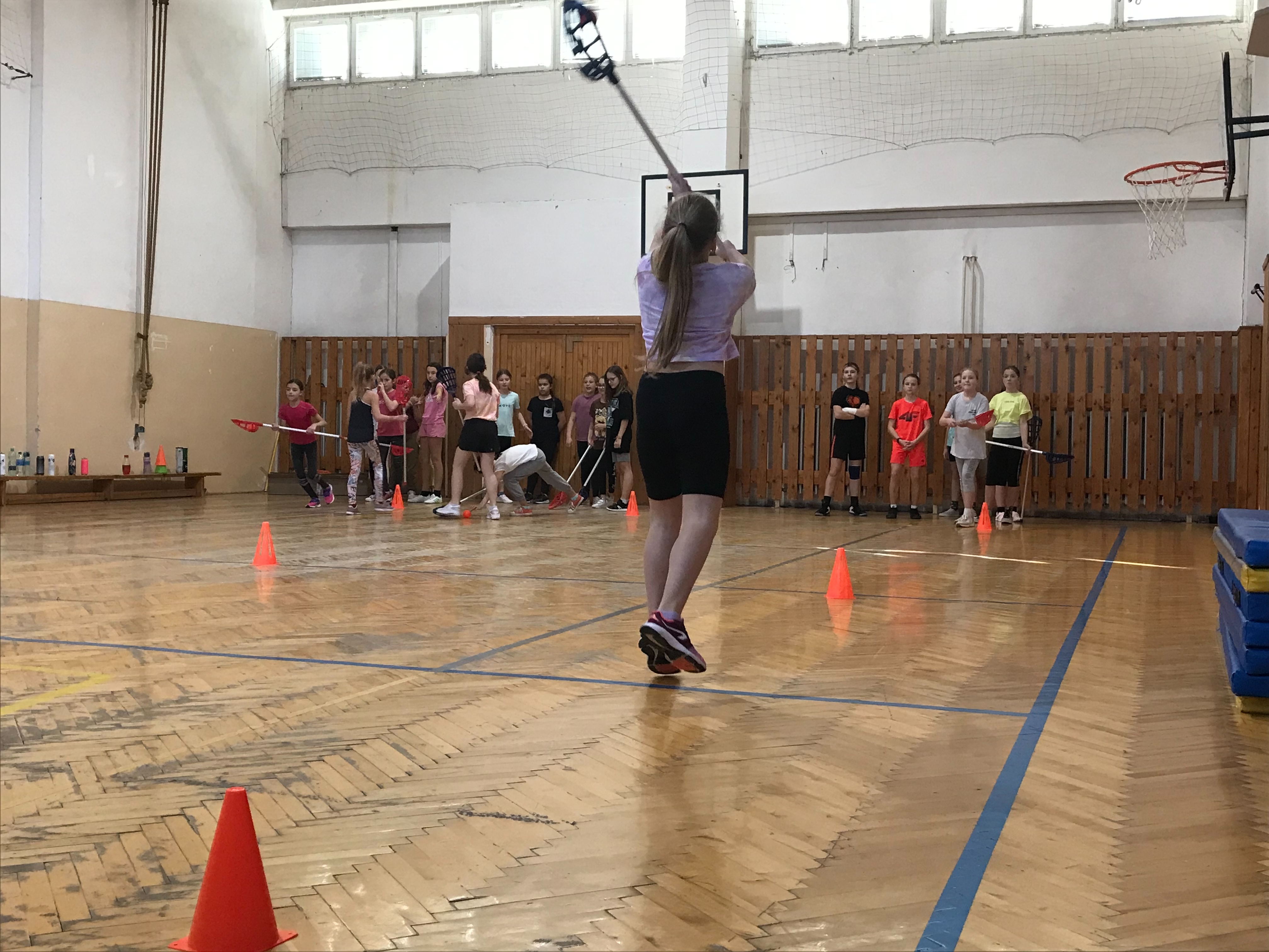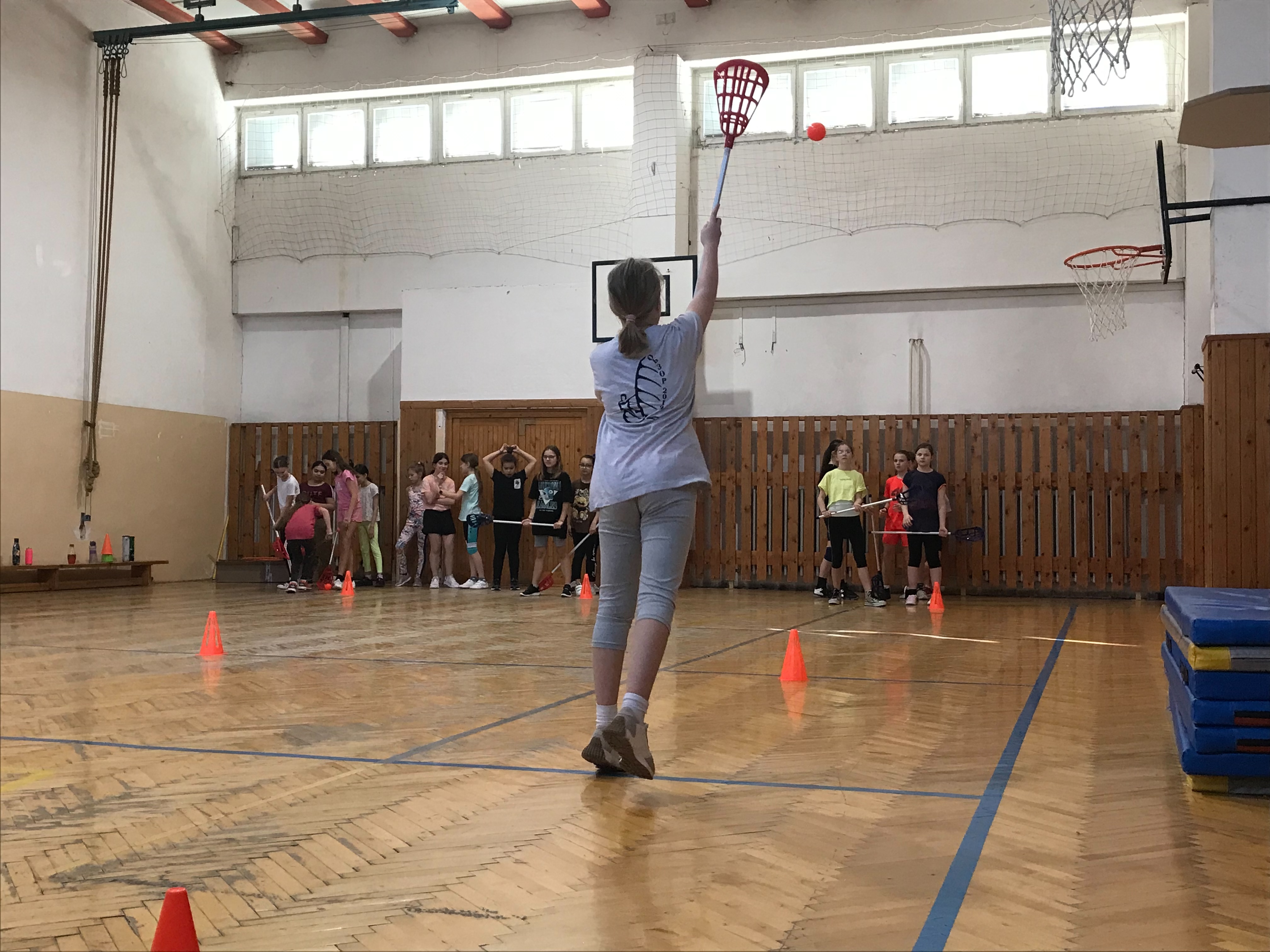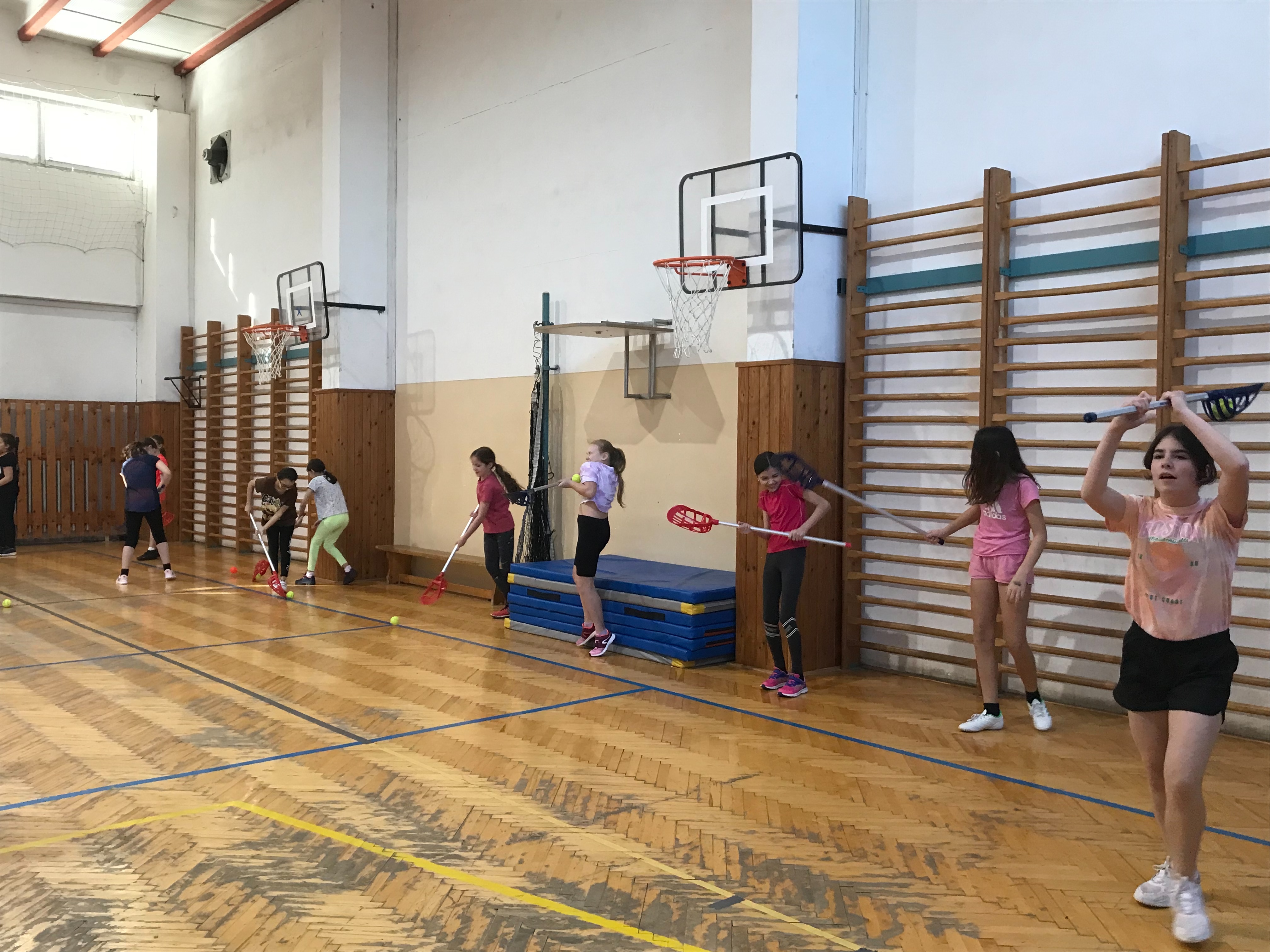 Vyučovaciu hodinu sme venovali zoznamovaním sa s intercrossovymi palicami, skúšali sme prihrávky a chytanie loptičky.