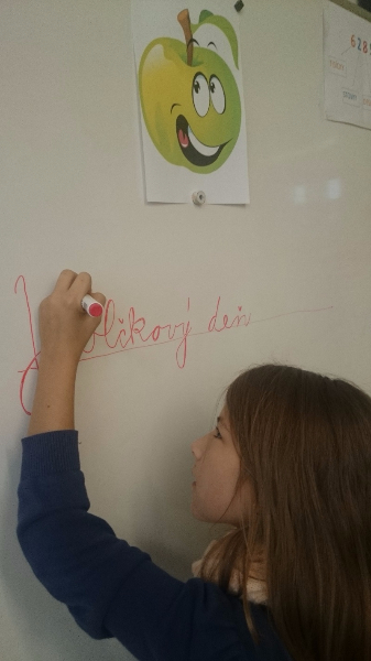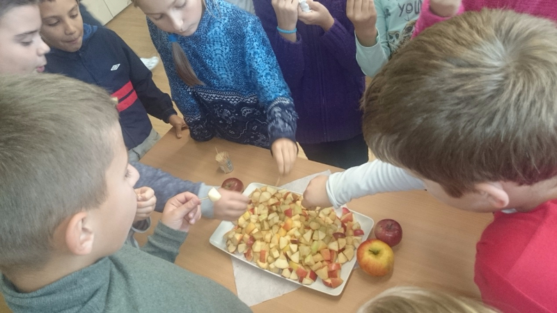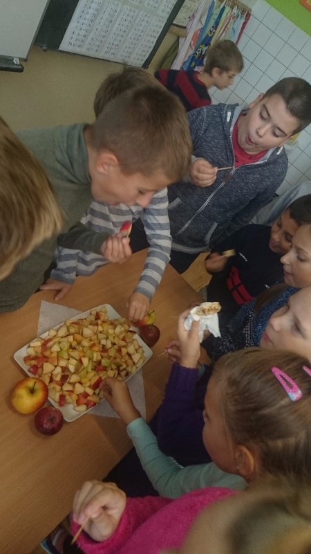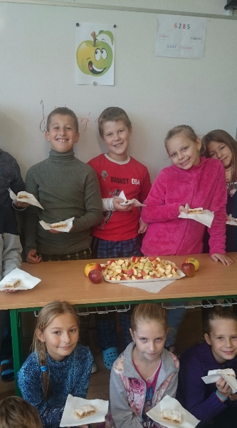Vo štvrtok sa žiaci 4.B triedy zamerali na aktivity venované Jabĺčkovému dňu. Najprv si pozreli poučnú prezentáciu o význame zdravého stravovania, najmä o význame konzumácie jabĺk, potom si zaspievali pesničky o jabĺčku – Červené jabĺčko vo vrecku mám, zatancovali si pri pesničke o jabĺčku od speváčky Kristíny. Pochutili si na šťavnatých kúskoch jabĺk posypaných škoricou, a tiež na jablkovom koláči. Všetkým chutilo, neostal ani jeden kúsok. 🙂