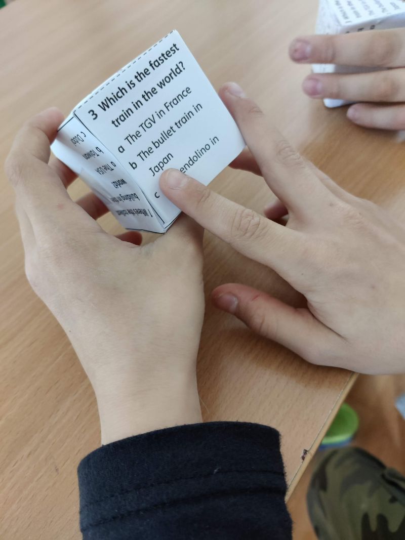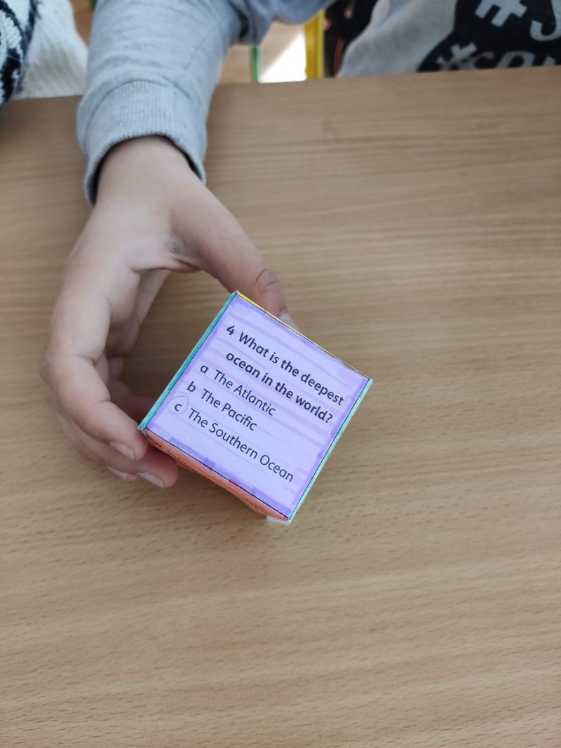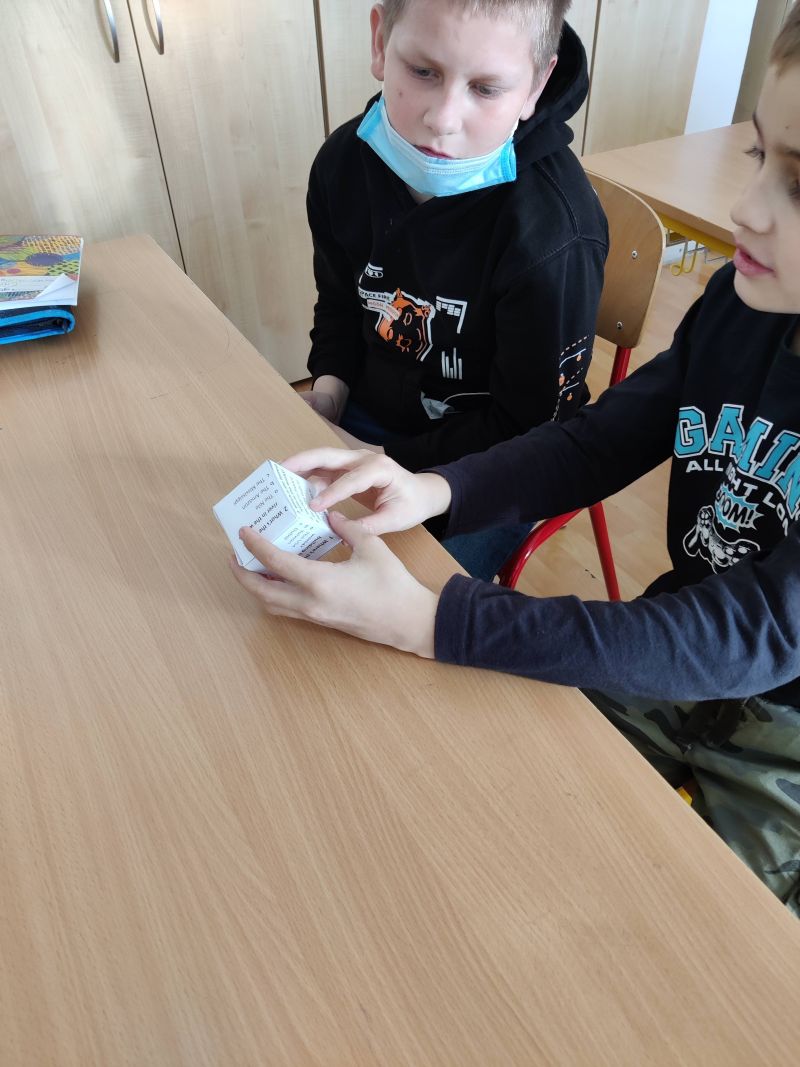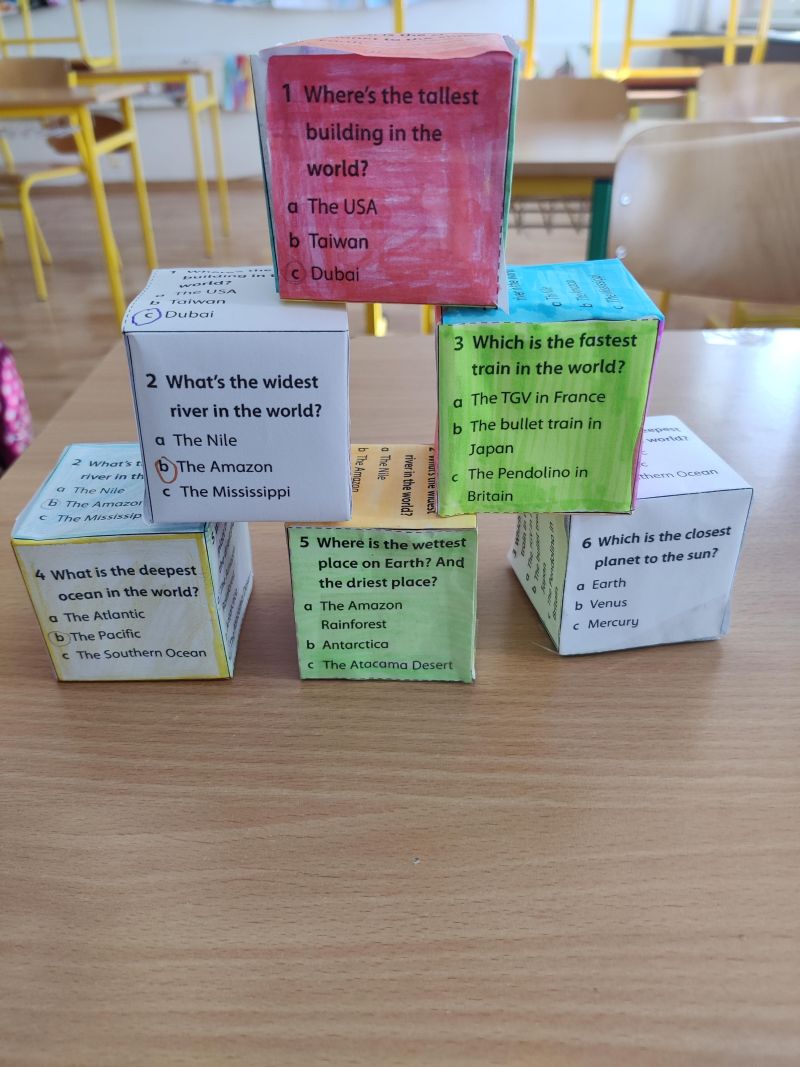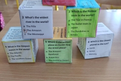 Žiaci si vyrobili hracie kocky, pričom na každej stene kocky bola otázka, napr. What´s the widest river in the world? Keďže žiaci ešte nepoznali odpovede na všetky otázky, využili internet a pomocou interaktívnej tabule si odpovede „vygúglili“. Pozrite si ich v priloženej fotodokumentácii.