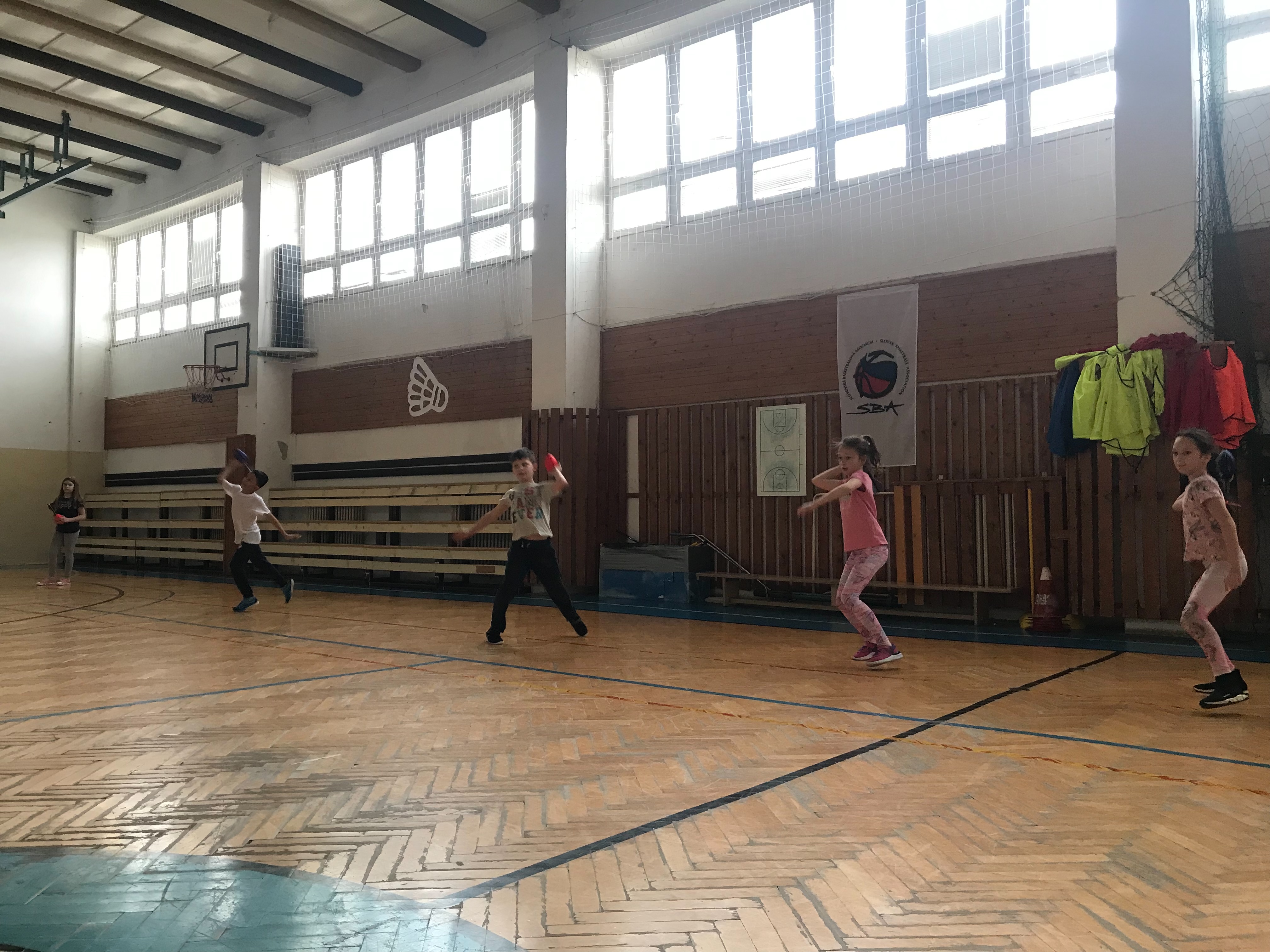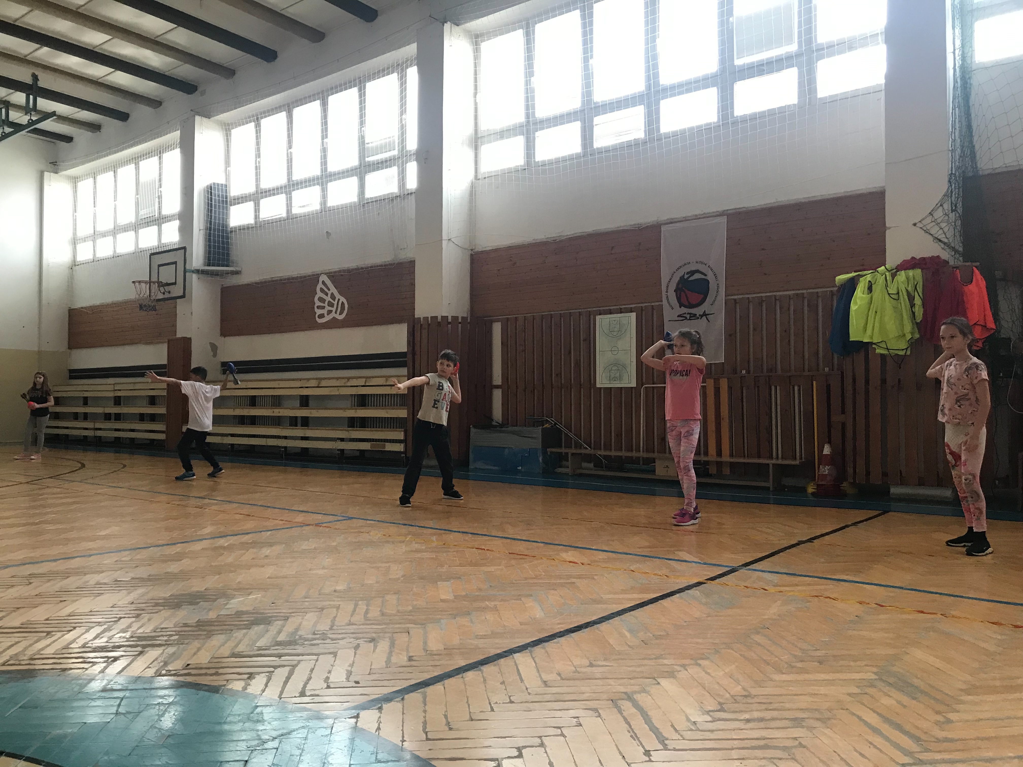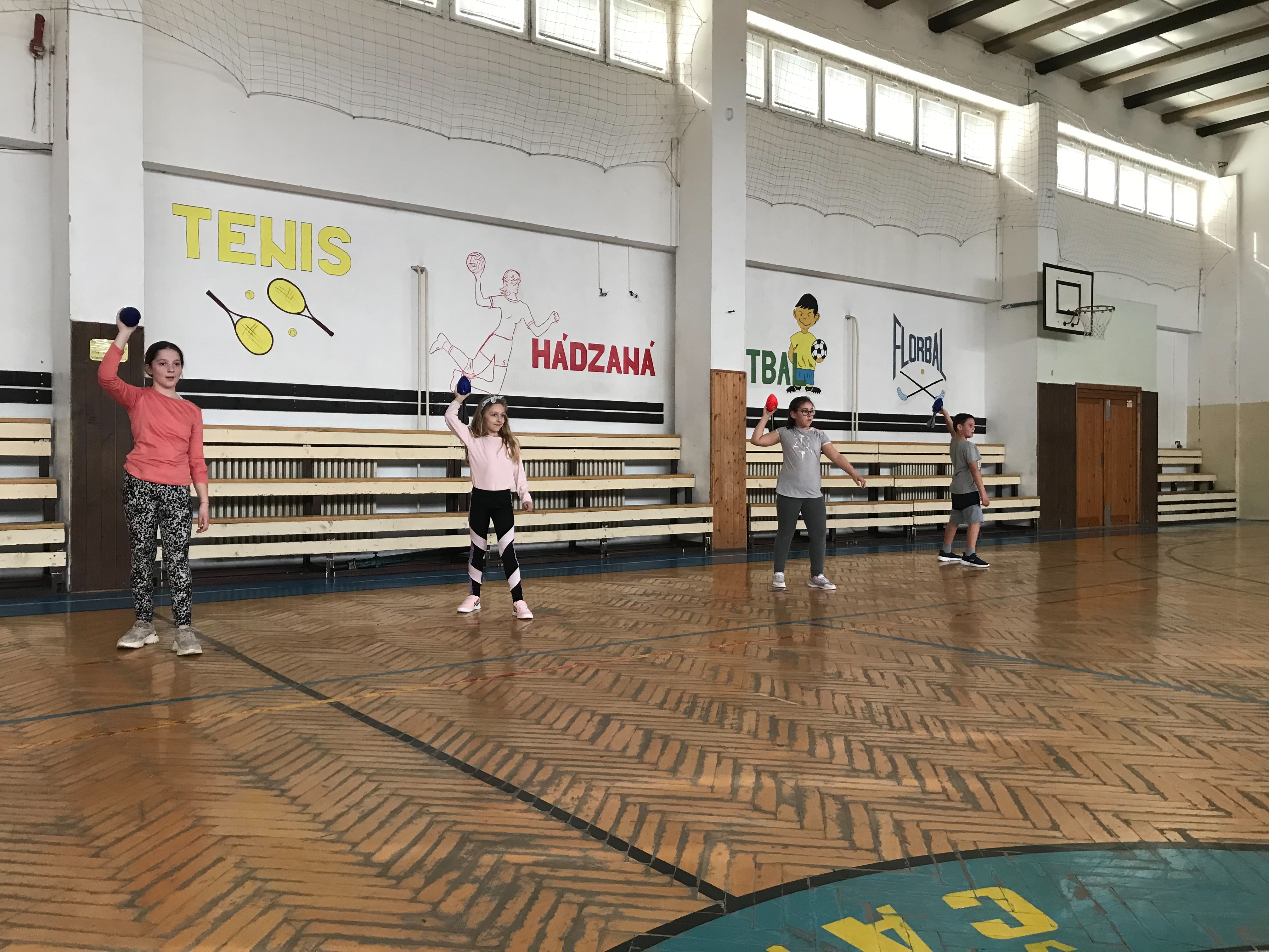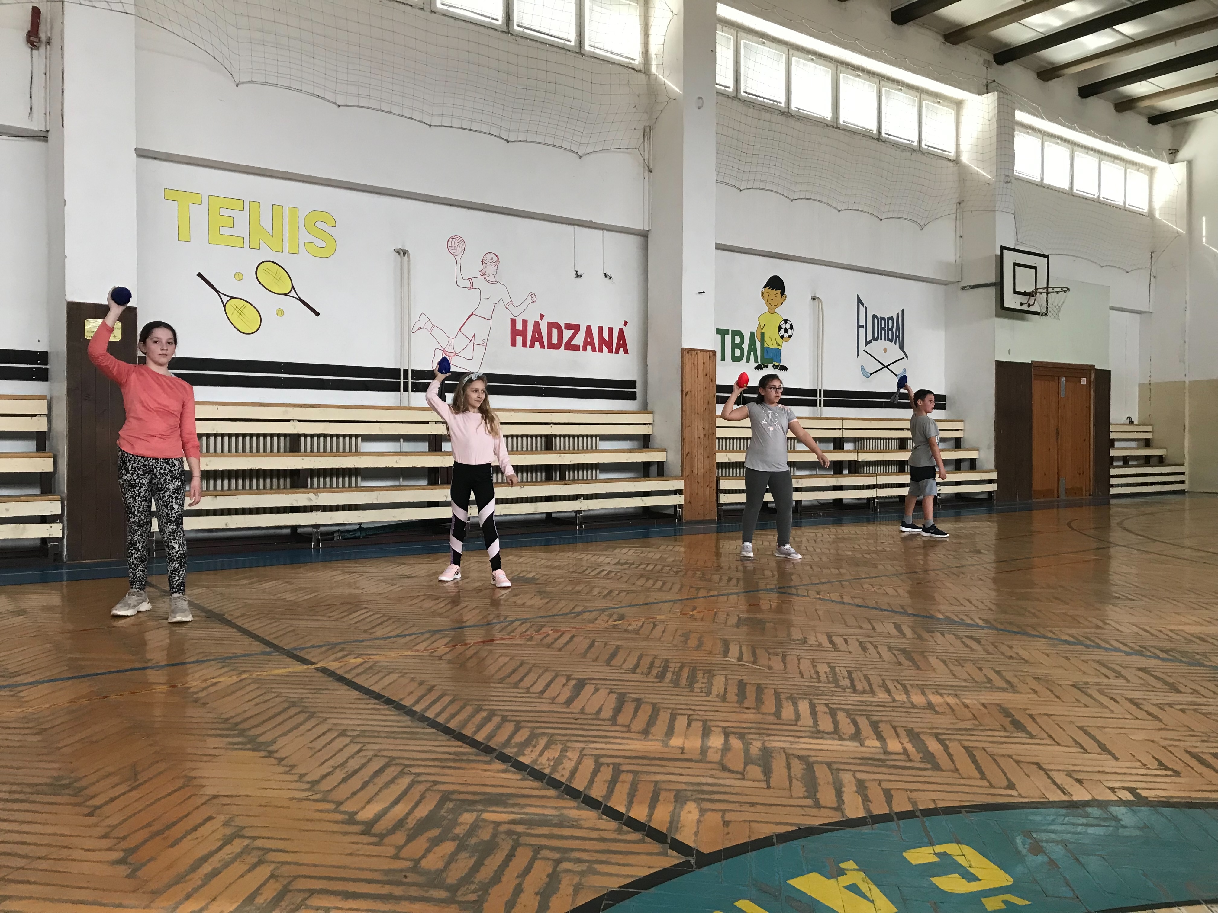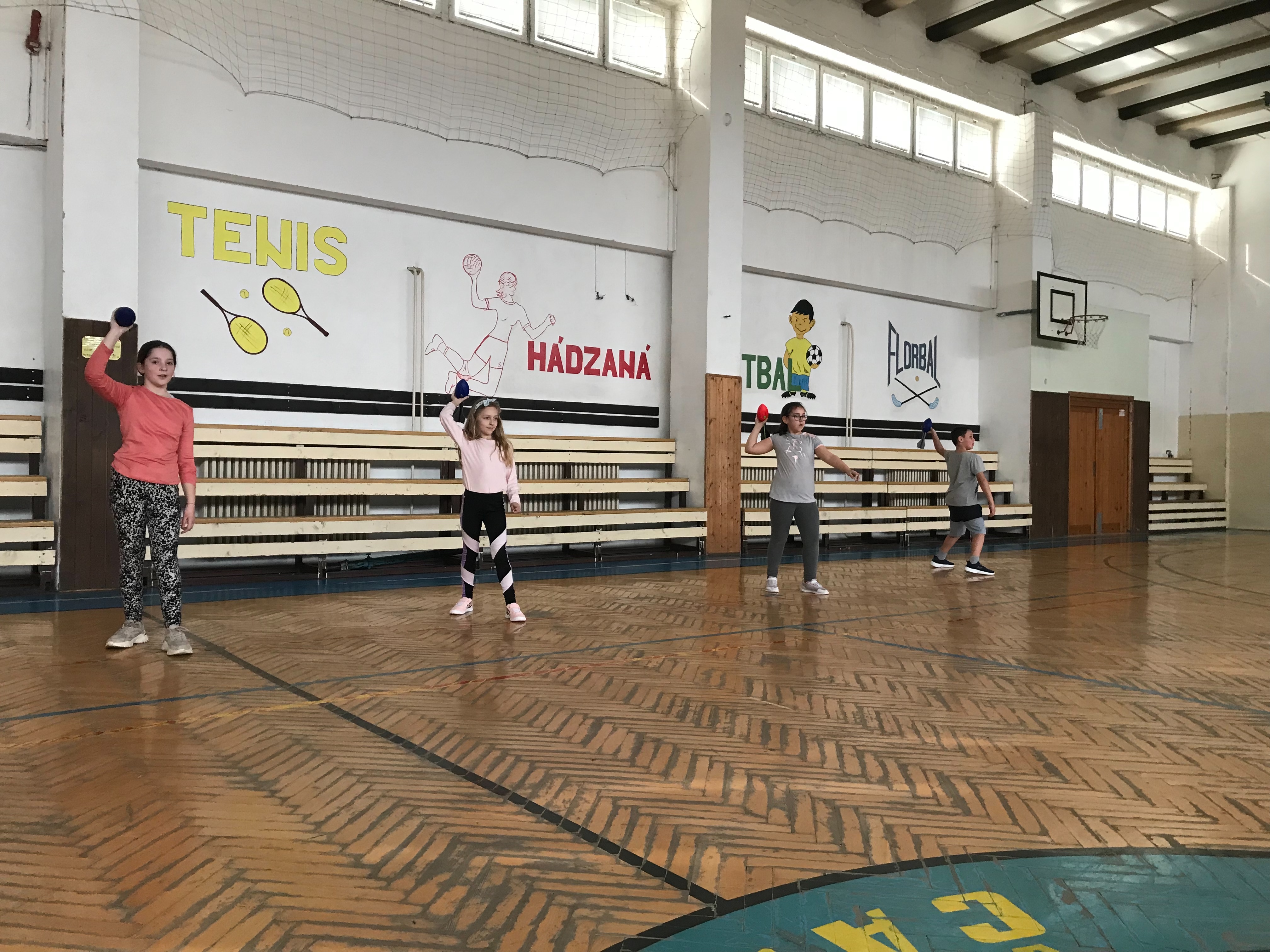 Na fotkách sú žiaci tretieho a šiesteho ročníka, ktorí využívajú rakety NERF . Tieto rakety žiakom slúžia na správny nácvik hodov, držania paže pri hodoch.